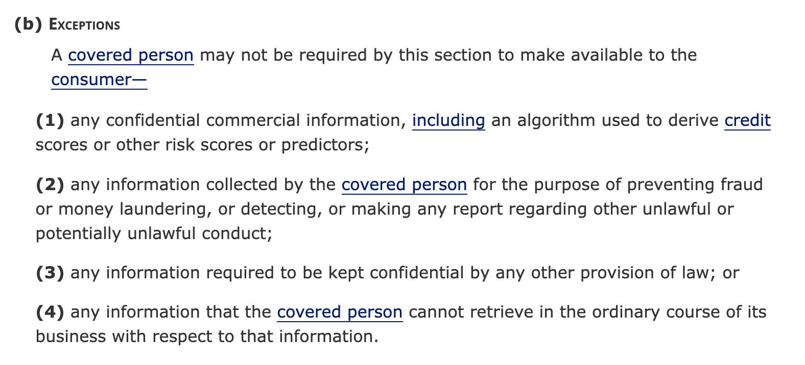 Second, the language of 1033 prohibits fees. This argument is a bit trickier. The section does not have any verbiage specifically addressing fees, but what it does do is (i) create a rule, banks must give consumers data access, and (ii) name exceptions to the rule.