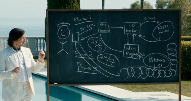 CEO Vlad Tenev took the stage in a pinstriped white suit and cravat1 and breathlessly broke down the project's thesis and backend. This product, currently only available outside of the United States, will create and burn tokens representing shares of equity securities. For those curious how this kind of program might work technically, the details will be interesting.
