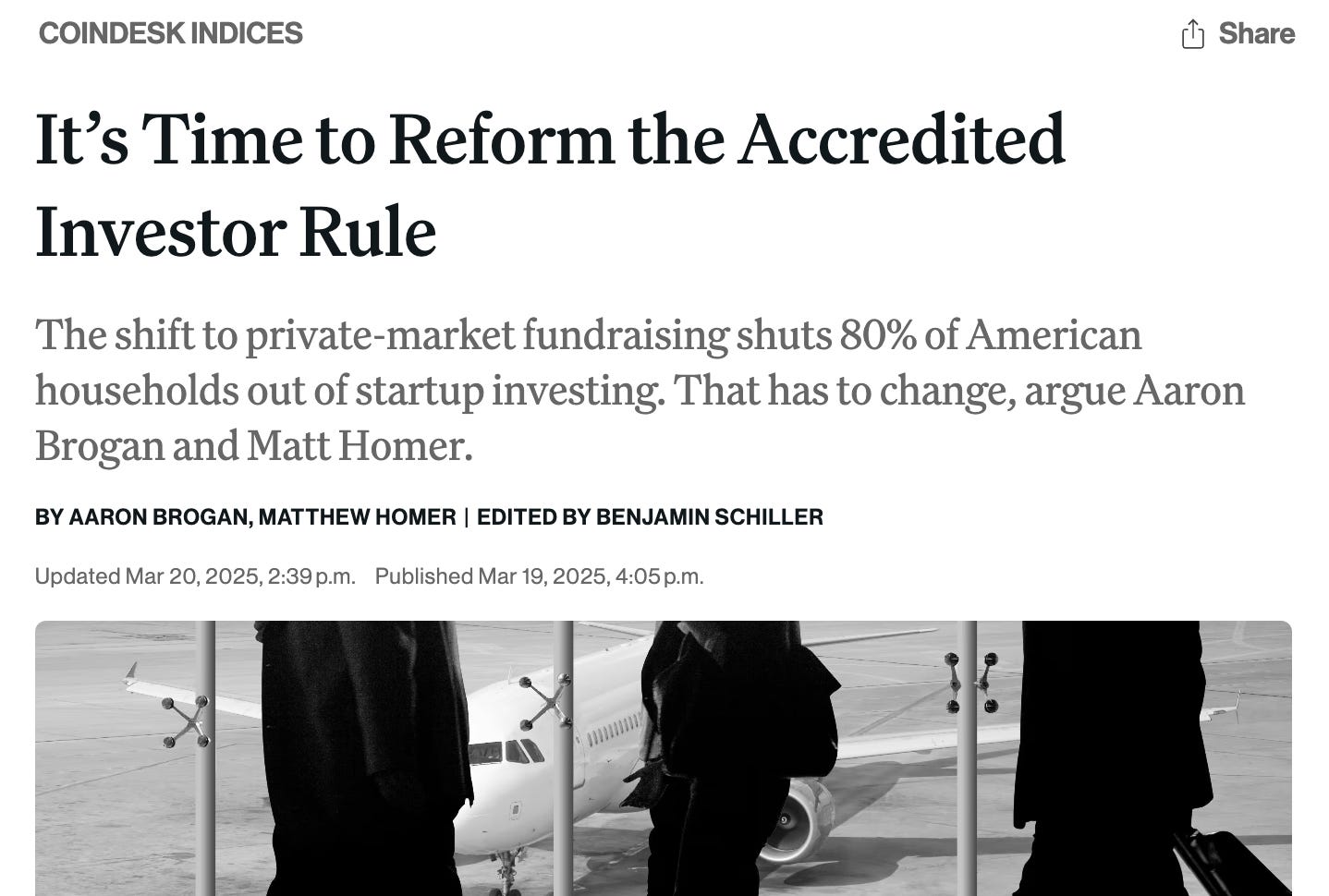 This is why Matt Homer and I proposed reforming the accredited investor rule in CoinDesk in March. The SEC is unlikely to go all the way and liberalize the free trade of equity tokens on public markets, but it might do so for accredited investors. That makes the definition of accredited investor the crucial unlock for the entire system to work.